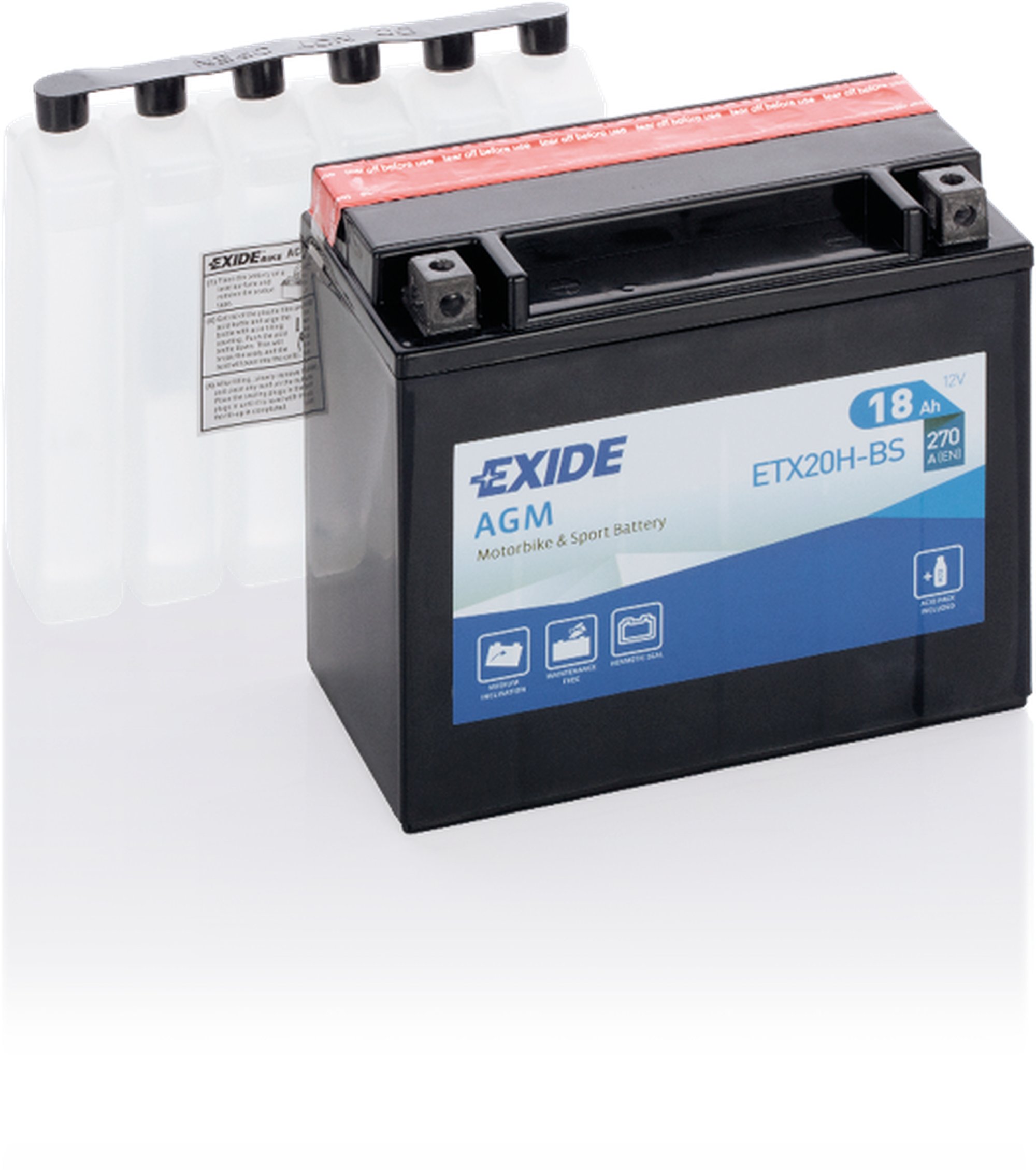 Exide AGM-batteriet är mycket driftssäkert och har lång livslängd; det fungerar problemfritt i kallt vinterväder och under krävande körförhållanden. Batteriet är helt underhållsfritt. Batterisyra fylls på endast före idrifttagning. Den använder AGM-teknik (Absorbed Glass Mat) och är en idealisk lösning för de flesta tillämpningar, t.ex. vattenskotrar.